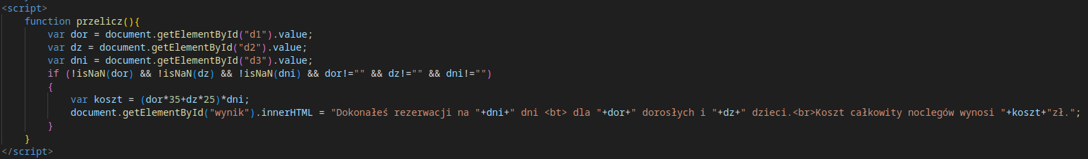 Program ten jest prostym narzędziem do obliczania kosztów rezerwacji noclegów. Użytkownik wprowadza liczby dorosłych, dzieci oraz dni, a następnie klika przycisk, aby obliczyć całkowity koszt. Wynik jest wyświetlany w dolnej części strony.